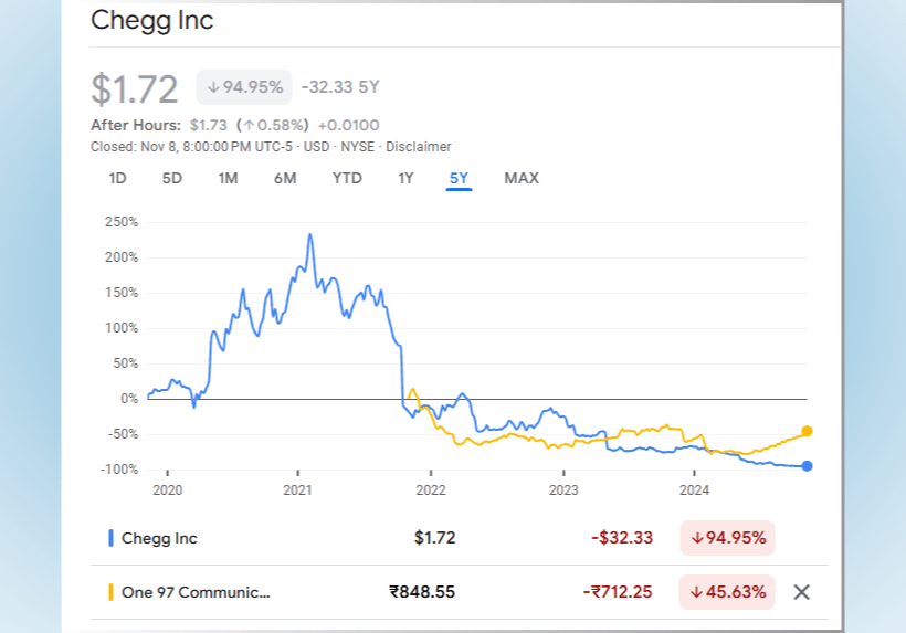 (Chegg Inc – A big fall from its tops led by Chat GPT and technological advancements that the co couldn’t avoid/keep up with) Similar with Paytm.