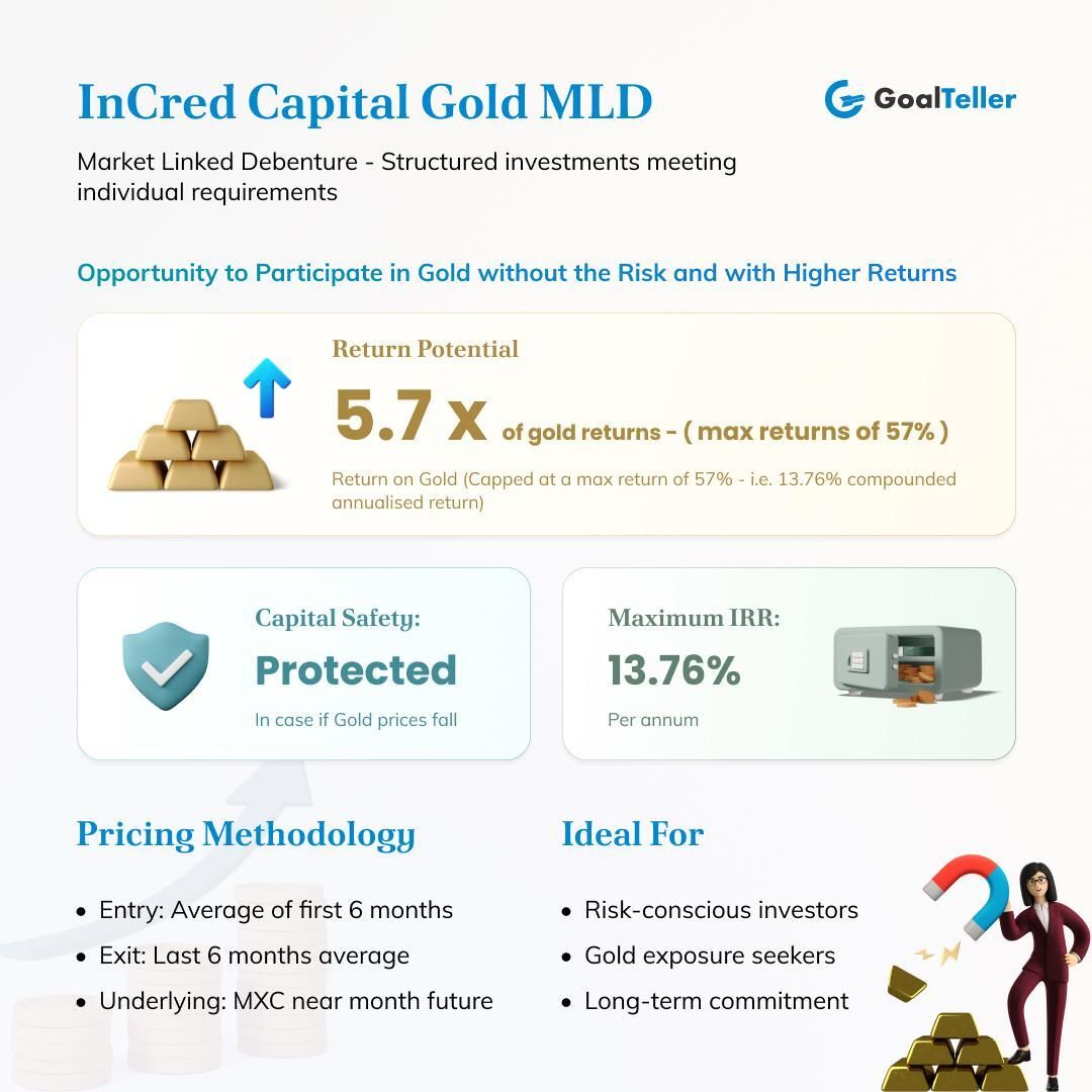 • Gold continues to move higher and higher - Considering the kind of upmove they have had and the perennial dilemma of when to invest - we have an interesting opportunity in a Gold Structured Product backed by Incred is something that investors who are either sitting on the sidelines or wish to lock gains now can explore (we are comfortable with the underlying credit of Incred). Please do consider and act with caution - we have appended the product below.