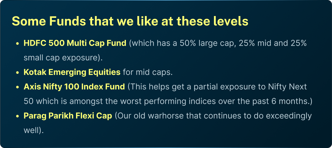 • Without dwelling on the short-term view, as mentioned earlier, do start/continue investing at these levels – anything levels below 23.5k Nifty can be used for partial investing and into relatively aggressive funds (as indicated last week).
